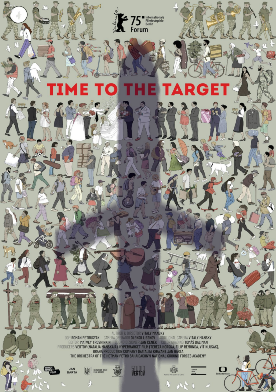 “如今,这些导弹飞抵目标所需的时间,正决定着每一个乌克兰人的生活。” 在《飞抵目标时间》中,维塔利·曼斯基记录了远离俄罗斯入侵前线的利沃夫的生活,那里人们的日常生活仍时刻受到从天而降的毁灭威胁的影响。这张海报凄美地描绘了这一点:死亡的阴影笼罩在继续生活的人海之上。