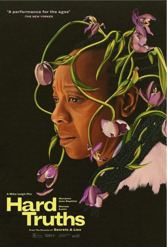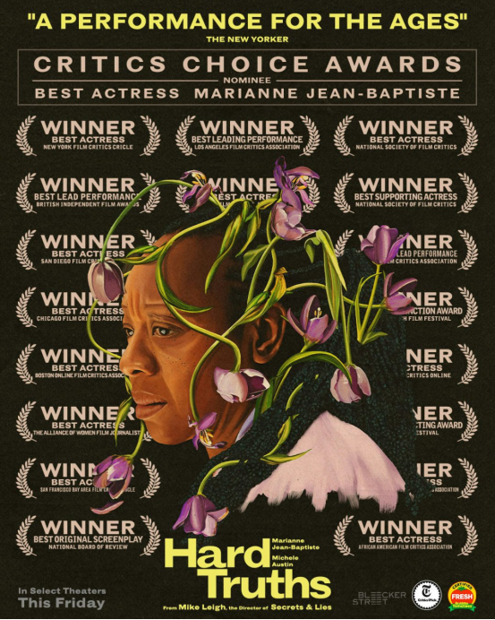 在迈克·李的悲喜剧《残酷真相》的海报中,玛丽安娜·琼-巴普蒂丝饰演的、脾气暴躁且厌恶鲜花的潘西,不情愿地被一顶花冠所包围。德西·摩尔绘制的肖像成功传递出忧郁与荒诞感——在颁奖季版本的海报中,琼-巴普蒂丝的形象与众多“获奖者”桂冠并置,这种对比更为强烈。