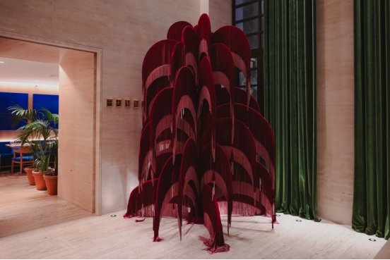 你可以在酒店入口处找到罗马艾迪逊酒店的圣诞树。它由米兰艺术家Sara Riccardi设计,她为此项目与历史悠久的都灵装饰织带工坊Antica Fabbrica Passamanerie Massia Vittorio进行了密切合作。最终成果是一棵引人注目的树,由纺织组合物和不同深浅红色的层叠流苏构成。这不仅仅是一场视觉盛宴,它还能调动视觉和听觉——铝制杆件能回响振动。这是一棵不仅值得欣赏,更值得体验的当代圣诞树。