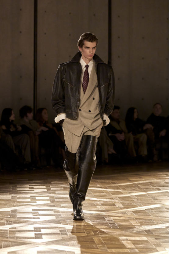 在戛纳电影节期间,为宣传探索停车场管理员害羞性格与摩托车手之间支配/服从关系的酷儿“dom-com”(家庭支配喜剧?)电影《Pillion》时,瑞典演员Alexander Skarsgård穿上了Anthony Vaccarrello为圣罗兰设计的过膝皮革防水长靴。这款在品牌当年早些时候时装秀上展示的靴子,成为了年度病毒式传播的配饰之一,从Pedro Pascal到Marc Jacobs等人都有穿着,并广泛出现在各大杂志的专题中。该系列的灵感源于对塑造了1980年代美学的两位男性——伊夫·圣罗兰和罗伯特·梅普尔索普——一次想象中的会面。整个系列捕捉了一种危险的性感基调,这一基调贯穿了整个季度,从普拉达的拼接皮革,到Maximilian Davis受皮娜·鲍什和乌珀塔尔舞蹈剧场慵懒性感启发的菲拉格慕2026春夏系列。Vaccarello称其为一种“威胁性、诱惑性的优雅”——经典男装中带着一丝另类癖好的转折。