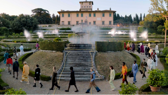 这被证明是今年最令人难忘的秀场地点之一:日落时分,映衬着如画般的佛罗伦萨天空,三宅一生褶皱男装将其2026春夏秀场设在了梅迪切亚·德拉·佩特拉亚庄园,这是一座位于托斯卡纳起伏群山Morello山上的前美第奇家族宅邸。作为Pitti Uomo男装展的嘉宾,三宅一生这一支线品牌借此机会推出了一种新的流动式时装秀形式:放弃了以往在巴黎时装周日程上的固定位置(其位置已被三宅一生家族另一品牌IM Men取代),它将在未来几个季度于世界各地的一系列地点进行展示。因此,系列将从当地景观中汲取灵感:在这里,是通过对色彩唤起性的运用来实现的,利用了设计团队在意大利各地旅行时采撷的色彩(从“五渔村黄”到“西葫芦花橙”)。最终呈现的系列将意大利魅力与三宅一生褶皱男装的先锋面料技术相融合:在别墅蜿蜒、迷宫般的花园中上演,令人无法不为之倾倒。