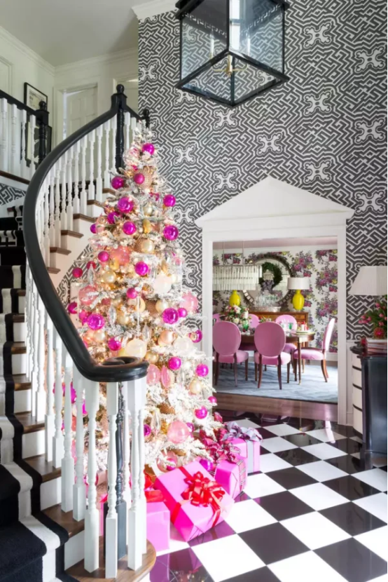 黑-白-粉的配色方案对于节日而言是清新、大胆且完全出人意料的,这使其非常适合非传统装饰。黑色增添了沉稳的精致感,白色保持了清爽和冬日的氛围,而粉色则带来了欢乐,又避开了经典的红色。你可以通过装饰品、丝带、蜡烛、餐桌布置甚至礼品包装来运用这种配色。这种组合同时呈现出图形感、现代感和趣味性,为你的节日布置增添一股时尚前卫的气息。