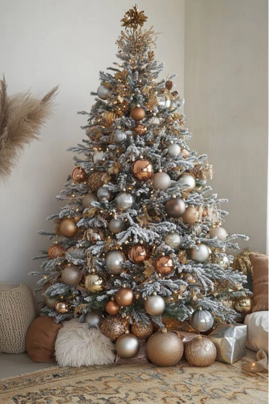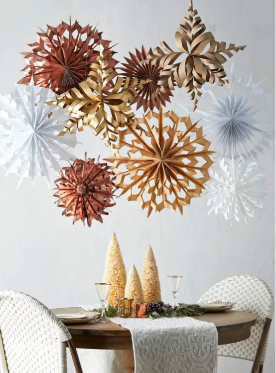 金属色是永恒的,但将其作为节日主题,尤其是在哑光或柔和饰面中运用,是一种极具现代感的手法。香槟金、刷纹黄铜、锡铅合金和玫瑰金饰品或烛台,为你的空间增添了魅力却不过分。你可以用金属花环、雕塑感物件、金属花瓶或闪亮丝带来营造节日光辉。这种配色与中性色、柔和色调或黑白装饰完美搭配。它为季节带来了奢华和精致感,却又不落入经典的圣诞俗套。