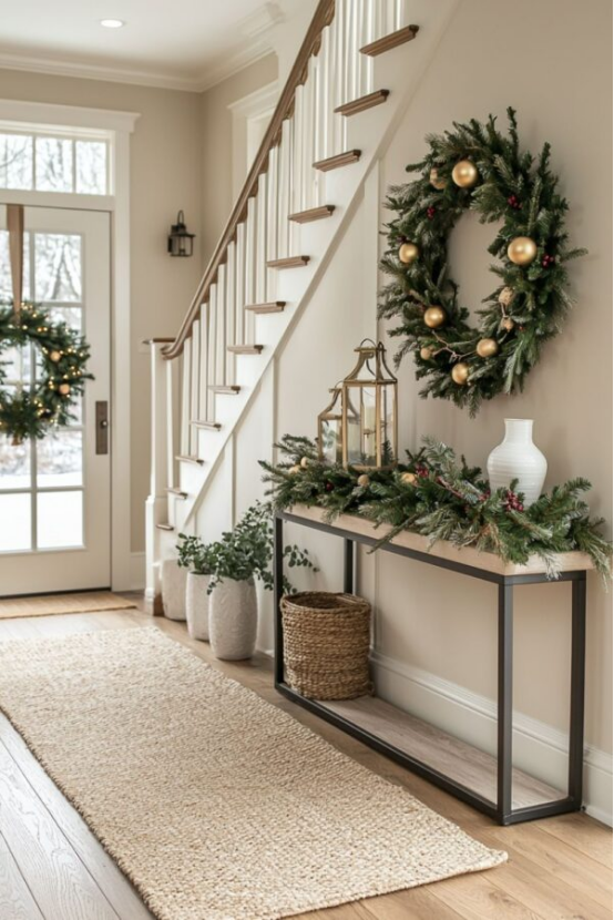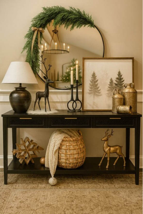 如果你打算跳过传统圣诞树,一个精心布置的边柜可以成为你节日装饰的主角。通过蜡烛、雕塑感饰品、陶瓷树、季节性树枝和叠放的书本进行层次搭配,打造一个考究、设计前卫的展示区。添加仙女灯或温暖的台灯等柔和光源,为边柜带来温馨的光晕。由于所有物品都集中在同一处,装饰显得有意图而非杂乱。这种方法在小空间、极简风格住宅或根本不适合摆放整棵树的公寓里尤其有效。