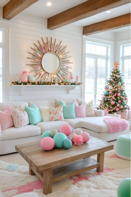 柔和色调的节日装饰为经典红绿配色提供了清新的替代选择,营造出一种轻盈、奇趣且现代梦幻的氛围。想想腮红粉装饰球、薄荷绿色花环、薰衣草色丝带或浅蓝色蜡烛搭配柔和的白色灯光。这些色彩与中性色内饰完美融合,为季节带来一种有趣而又宁静的情绪。无论是用在花环上、布置在边柜上,还是融入餐桌布置中,柔和色调都传递出一种轻松的节日精神,易于实现且极具拍照效果。