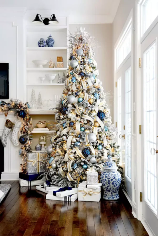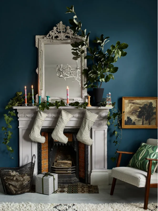 蓝色圣诞调色板——海军蓝、钴蓝、冰蓝、青绿色或灰蓝色——为传统节日色彩创造了一个冷静、现代的替代方案。蓝色与银色、白色、玻璃和自然纹理完美搭配,使其易于适应不同的室内风格。无论是海军蓝花环、蓝色天鹅绒丝带、青绿色装饰球还是冰蓝色蜡烛,这种配色都让人感觉很有冬日气息却又不落俗套。蓝色也令人平静、优雅且极具拍照效果,是那些想要精致、清新节日美学的设计爱好者的完美选择。