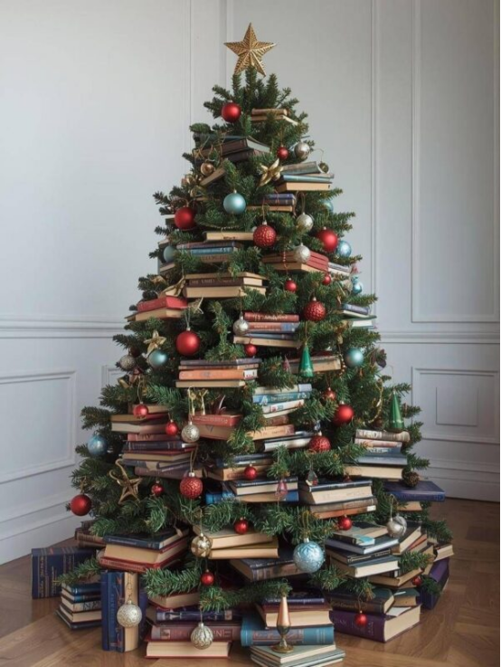 对于藏书丰富的设计爱好者来说,你的书架可以在节日期间客串一次主角。将书本堆叠成螺旋上升的圆锥形状来模仿圣诞树——但这种方式要聪明且更具建筑感得多。选择单色调的书皮(深绿色、午夜蓝、纯白色),或者随性地堆叠出彩虹的每一种颜色。在顶部放一个星形书挡,再用一串微光灯串缠绕在书堆之间。它立刻就成为一件充满奇趣的知性艺术品——并且绝对是引发对话的亮点。