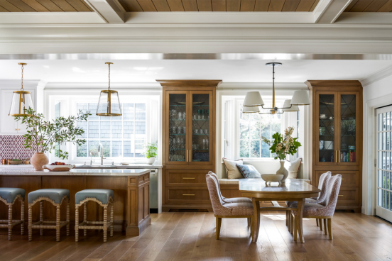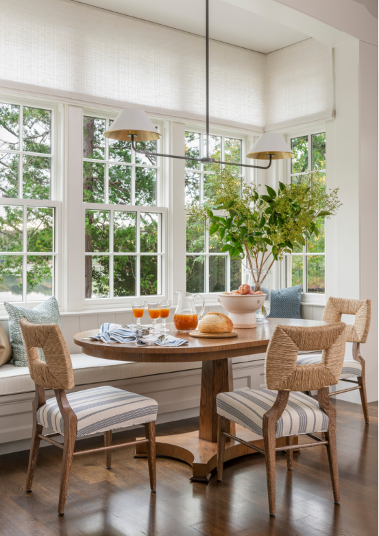 Brookes + Hill Custom Builders为新英格兰的魅力注入了这个波士顿地区的早餐角落。一排六乘六的飘窗为空间注满了光线,而内置的长椅、复古风格灯具和传统木作则创造了一个温馨、受历史风格启发的完美角落,适合晨间咖啡或休闲餐点。