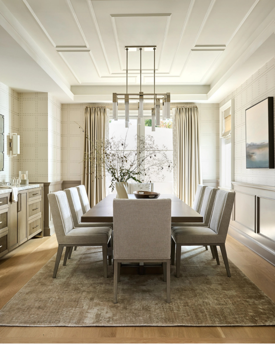 在这个正式餐厅中,奶油色、灰褐色和棕褐色的配色方案柔和了洛杉矶强烈的阳光,使得空间明亮却不刺眼。丰富的细节层次提升了空间质感,从图案地毯和浮雕墙纸,到传统的护墙板、凹槽饰面柜和褶皱窗帘。来自ClassicWorks的定制木作天花板增添了最后的点睛之笔,创造出一个平静、富有纹理的房间,每一瞥都能发现新的细节。