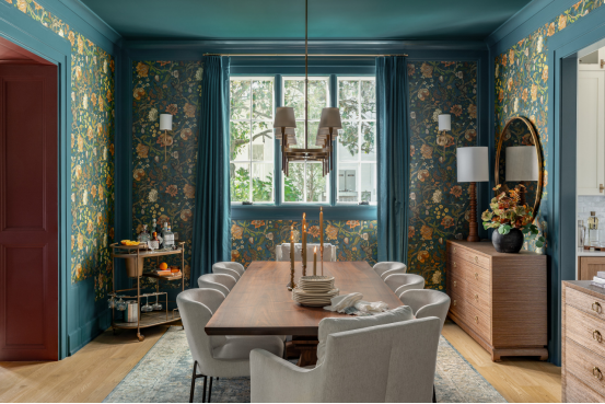 Asha Maía Design在拥抱传统正式餐厅精神的同时,为这个弗吉尼亚州北部的餐厅空间注入了丰富的个性。一张充满生机的植物墙纸奠定了基调,配以复古风格酒吧推车、分层照明、超大镜子和弧形软垫椅。一张图案丰富的土耳其地毯,以及深蓝绿色的天花板和装饰线条,共同完成了整个场景——一个充满活力、极繁主义的混合风格,保证能激发生动的晚餐对话。