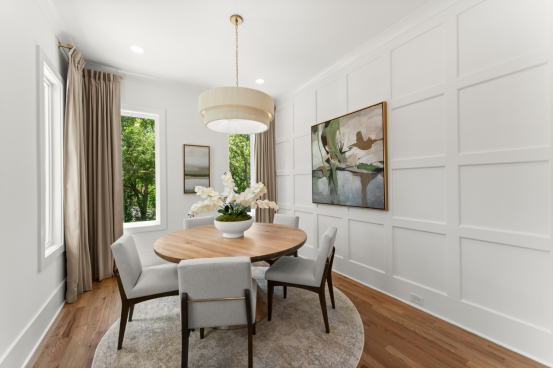 这个位于乔治亚州玛丽埃塔的餐厅,其魅力源于形状的互动。Bercher Homes引入了一面线性的木作装饰墙,以增加深度和结构感,然后用圆桌、圆形地毯和曲线灯具与之形成对比。利落的线条与柔和的曲线相结合,创造出一个平衡而诱人的空间。
