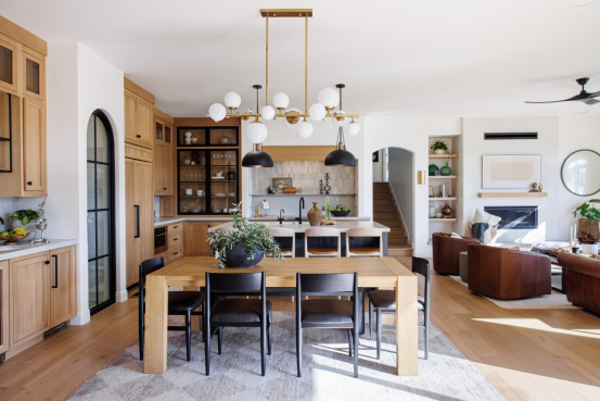 在开放式布局的住宅中,视觉提示可以在不封闭空间的情况下保持各区域分明。在这个加州奇科的餐厅里,Airehart Construction通过一个兼具酒吧和自助餐功能的内置家具达成了这种平衡,标志着从厨房区域的过渡。一盏大型吊灯和一张尺寸充裕的地毯锚定了厚重的餐桌,创造出一个连贯而又独立定义的用餐区域。