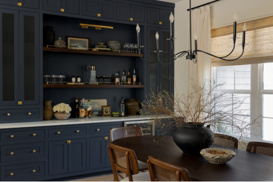 德克萨斯州奥斯汀的这次翻新工程将这个餐厅向厨房敞开,创造了无缝、和谐的流动感。Audrey Scheck Design定制打造了一个内置墙柜,兼具酒吧和自助餐功能。海军蓝、胡桃木和黄铜材质的橱柜为玻璃器皿、亚麻布和大餐盘提供了充足的存储空间——并留出了展示特色梅斯卡尔酒和威士忌酒瓶的位置——将实用性与引人注目的风格融为一体。