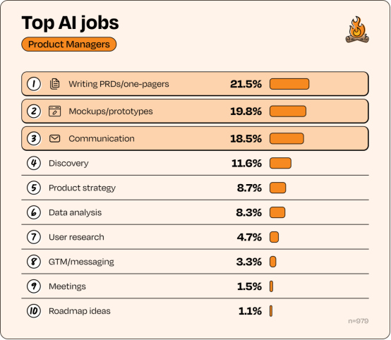 排名第二的原型制作,标志着当前正在发生的众多角色边界变化之一。借助Lovable、v0等工具,产品经理越来越多地能够不依赖设计,直接从想法过渡到原型。