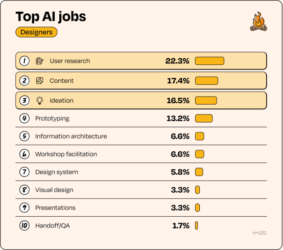 AI正在帮助设计师处理与设计相关的一切事务(研究分析、文案、构思),但视觉呈现工作仍然顽固地由人类主导。同时,比较原型制作:产品经理将其排在第二(19.8%),而设计师将其排在第四(13.2%)。AI正在为产品经理解锁其核心工作之外的技能(至少在原型制作方面是如此),而设计师并未从AI执行其核心工作中获得显著的边际效益提升。