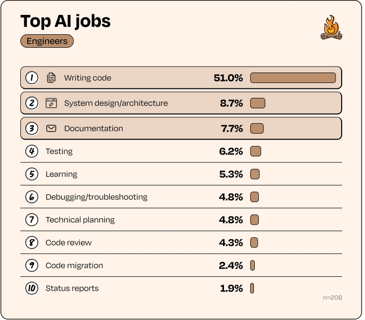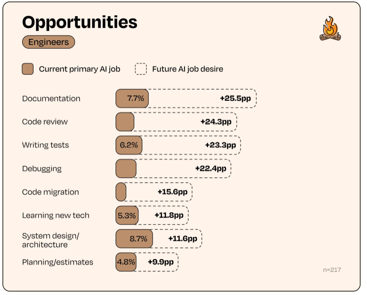 工程师正将AI的使用转向处理代码编写之后的工作。 编写代码是目前最受欢迎的用例(51%),但其需求差距仅为+5.6个百分点。然而,编写文档(+25.8个百分点)、代码审查(+24.5个百分点)和编写测试(+23.5个百分点)都显示出工程AI工具领域的巨大增长机会。