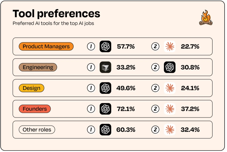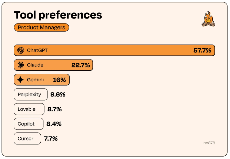 ChatGPT、Claude和Gemini在产品经理群体中名列前茅——它们是如此多功能的工具,非常适合产品经理的工作。 最有趣的是看到Cursor紧随Gemini之后(我们没想到像Cursor这样的工程工具会在产品经理中如此受欢迎),其次是Lovable(目前似乎在原型制作市场占据优势)。
