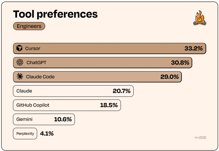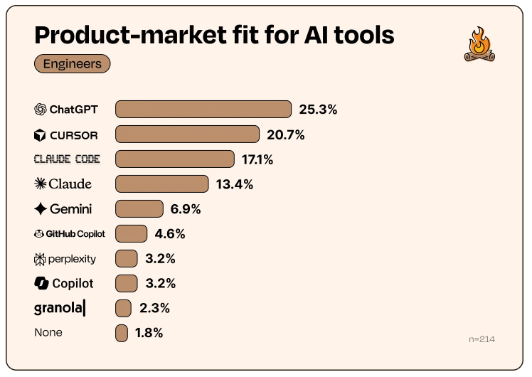 需注意:Copilot (8.4%) 在产品经理中的使用率略高于 Cursor (7.7%),但对于工程师则相反。这可能反映了大型公司中微软生态系统的锁定效应,或者只是产品经理先发现了Copilot且尚未探索其他选择。