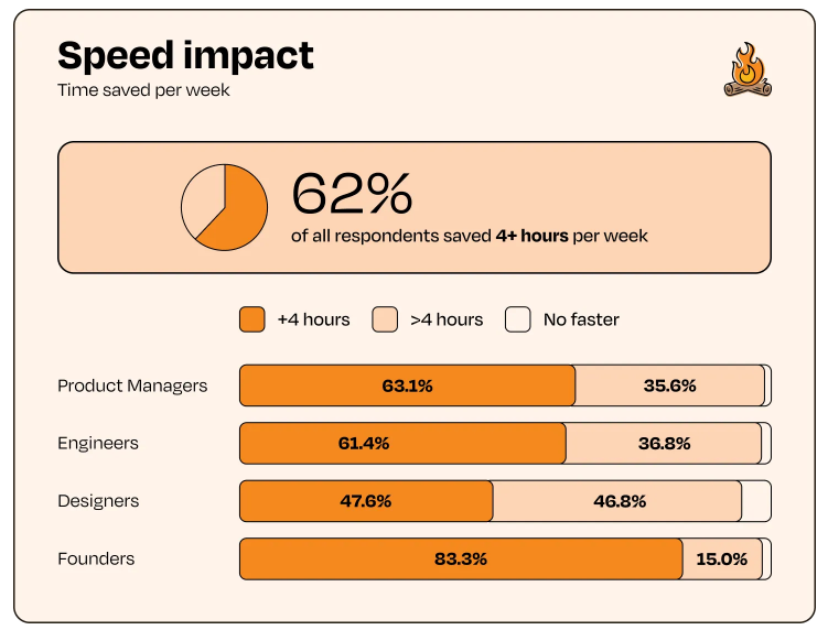 63%的产品经理和83%的创始人报告AI每周为他们节省4小时以上。 即使是最持怀疑态度的群体——设计师,仍有47.5%的人报告每周节省4小时以上。只有1%到5%的各角色受访者表示AI"不比手动工作快"。