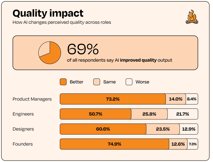 然而,在工作质量方面,情况则更为复杂。产品经理和创始人持乐观态度(超过70%的人报告质量提升),但工程师的看法则更为分化。51%的工程师告诉我们AI使其工作质量变得更好,但有21%的人表示更差。 设计师介于两者之间,60%认为更好,13%认为更差。工程师对质量的评价可能反映了代码正确性的更高标准:一份"稍好一些"的产品需求文档初稿是有用的;但一个"稍好一些"但充满错误的函数则不然。此外,糟糕的代码比糟糕的产品需求文档更容易被发现。
