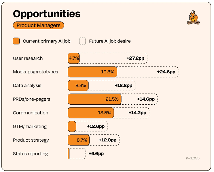 对于产品经理来说,最大的机会在于研究。 用户研究在所有任务中显示出最大的需求差距(+27.2个百分点)。目前只有4.7%的人将其作为主要的AI用例,但近三分之一的人希望如此。模式很清楚:产品经理已经掌握了如何将AI用于产出型任务,如撰写产品需求文档和起草沟通内容,但他们渴望将其应用于上游,应用于理解要构建什么这一混乱的工作中。