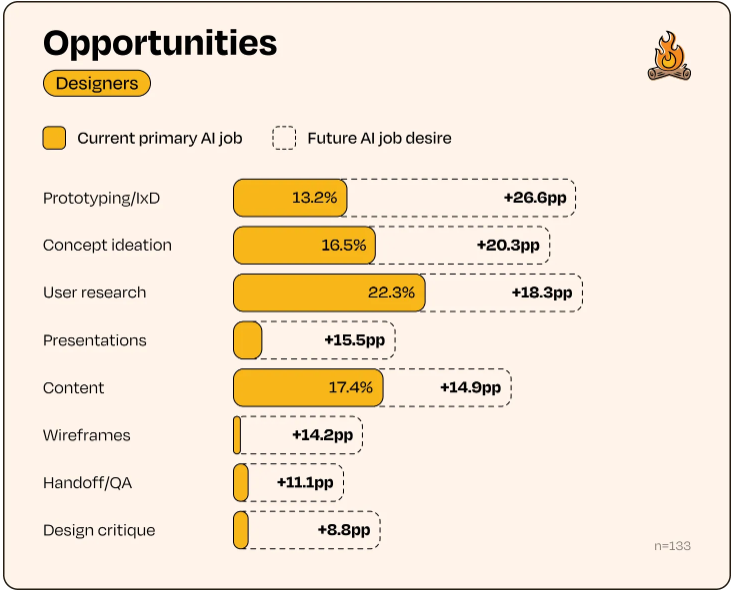 原型制作是一个突破性类别。 对于产品经理, "创建原型/模型" 从目前使用的19.8%跃升至希望使用的44.4%,增长了24.6个百分点,这使其成为最受期待的未来用例。对于设计师,原型制作和交互设计也显示出类似的势头(增长27.8个百分点)。这与Lovable、v0、Replit和Figma Make等工具的兴起相符:人们已经看到了可能,并希望获得更多。