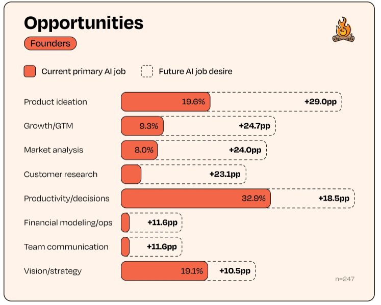 创始人已经将AI大量用于个人生产力提升(目前为32.9%),但他们希望向上游移动。他们正在寻找一个战略合作者来验证想法、探索市场和思考市场进入策略——AI作为联合创始人,而不仅仅是助手。