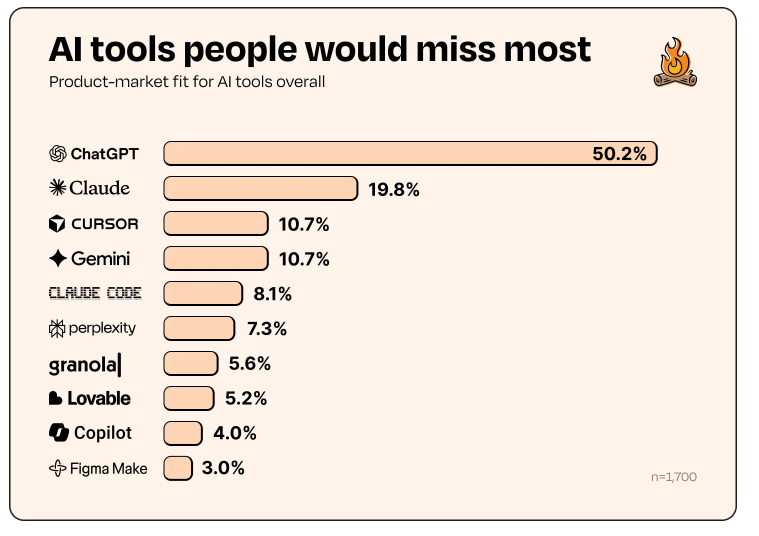 我们询问:"如果失去对哪些AI工具的访问权限,你会非常失望?"这是经典的肖恩·埃利斯产品市场契合度问题。83.6%的人至少提到了一款工具,这本身就标志着AI已深度融入日常工作流程。但是,定期使用某工具的人数与该工具若消失会让人想念的人数之间的关系,揭示了真正找到产品市场契合度的产品。
