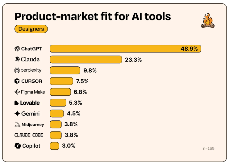 设计师(23.3%)和创始人(20.6%)对Claude的依赖指数最高。Claude生态系统(Claude和Claude Code合计)总体覆盖率达到27.5%。这对Anthropic来说似乎是一个巨大的胜利。