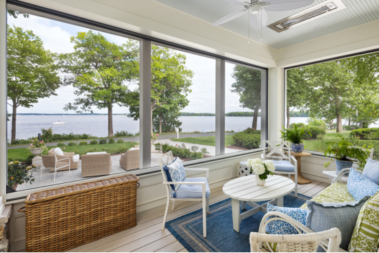 这个位于明尼苏达州明尼汤卡湖的封闭式纱窗门廊,全年都邀请人们来此放松。由Pillar Homes设计,该空间采用了框式纱窗,不仅外观精致,也为该地区严酷的冬季提供了额外的耐用性。天花板上安装的加热器延长了门廊在春秋较凉时节的使用时间,为晨间咖啡或晚间交谈创造了一个舒适的避风港。