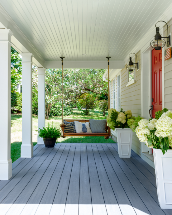 Woodland Builders通过改造并增建门廊,将马萨诸塞州南岸的这处住宅变成了一个家庭的永久居所。新门廊配有洋葱形灯笼、高大的花盆、珠板天花和一道令人愉悦的红色大门,营造出热情好客的第一印象。一个经典的门廊秋千提供了一个宁静的驻足点,可以欣赏景色,在家门口享受片刻安静时光。