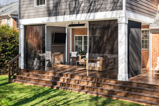 这个来自北卡罗来纳州夏洛特市的门廊,由ReVision Design/Remodeling打造,能适应每个季节和场合。可伸缩的百褶纱窗沿着隐蔽的轨道滑动,根据需要防虫或向庭院开放空间。壁炉、电视和宽敞的组合沙发使其成为一个放松、娱乐或与家人共度时光的多功能场所。
