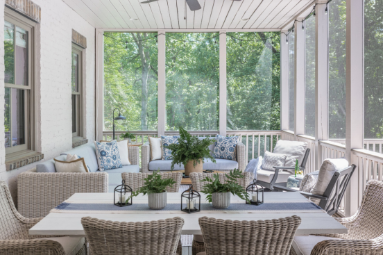 LAH Interiors为这个位于田纳西州纳什维尔的门廊带来了轻松的海滨气息,使其感觉像是汉普顿的度假胜地。藤编家具、浮木色调以及白色、棕褐色和蓝色的布艺共同营造出宁静诱人的氛围。空间平衡了精致与舒适,是休闲、娱乐或安静欣赏景色的绝佳场所。