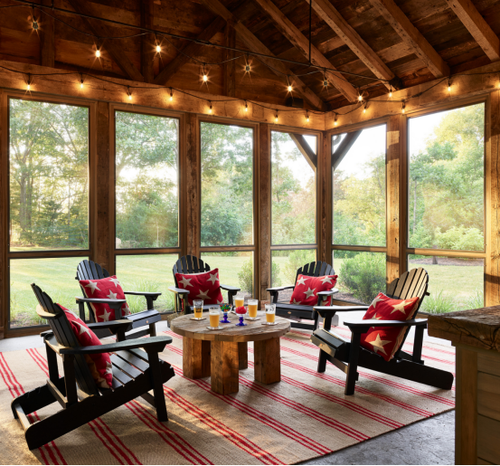 AG&Co. Interior Design为这个位于波士顿北岸的封闭式纱窗门廊捕捉了夏令营的魅力。经典的阿迪朗达克椅围绕着一张粗犷的木桌摆放,搭配条纹地毯和星条旗图案抱枕,营造出温馨怀旧的聚会点。裸露的木梁、墙板和椽子完善了乡村风情,使门廊非常适合讲故事、放松或在串灯下享受夜晚。