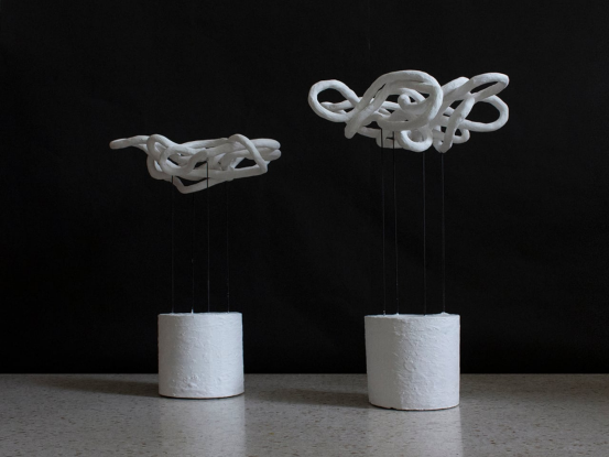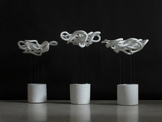 这些石膏环圈在自然接触处连接,形成簇状,类似沙丘或珊瑚等自然形态。灯体由纤细的钢棒支撑于混凝土基座上,隐藏了光源,点亮时在墙壁和天花板上投射出戏剧性的光影图案。其效果半是照明,半是艺术装置。