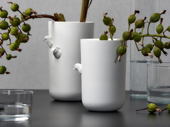 麻雀精妙的细节与花瓶光滑、如大理石般的白色表面形成鲜明对比,凸显了精湛的工艺与克制的设计。麻雀不仅引入了视觉魅力,也与瓶内插花的有机之美相呼应。形态、质感与雕塑感的点缀共同创造了一个感觉宁静、独特且略带诗意气息的花瓶。