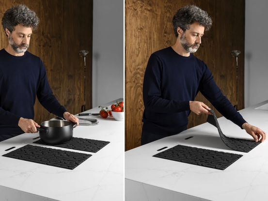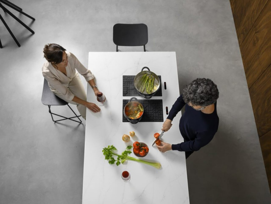 隐藏在台面下的《Lapitec Chef 电磁炉系统》增强了这种现代设置。通过硅胶垫激活,它可将白色台面转变为功能齐全的烹饪表面,同时保持工作区的整洁与多功能性。
