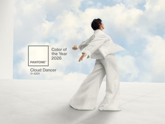 潘通为2026年做出了一个令人惊喜的转向,选择了一种近乎无重感、乍看简单,却又足够有反射性来映照周遭所有色彩的颜色。「云上舞白」(PANTONE 11-4201),一种柔和、空灵的白色,作为一剂舒缓的解药出现,呼应着一个渴望宁静、清晰与心灵重启的世界。