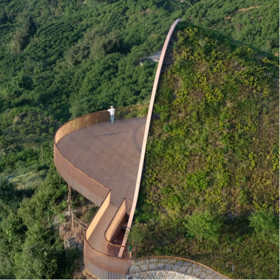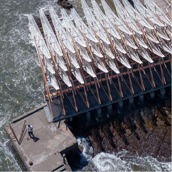 游客可以坐在木结构基座的长凳上休息并观海。设计增加了一个钢筋加固平台,用以支撑轻质的木结构框架,以抵御强劲的海风和台风。