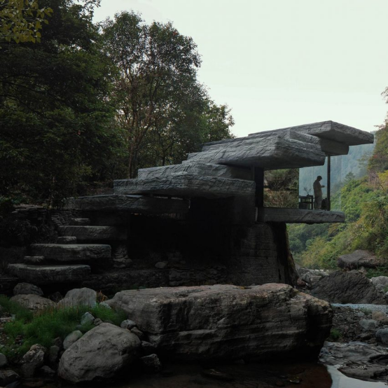 直向建筑设计通过三个雕塑般的石砌亭子,构建了一个艺术中心,分别容纳图书馆、活动空间和户外舞台。设计灵感源自贵州省本土的喀斯特溶洞形态,每个亭子内部都经过独特的掏空雕刻处理。