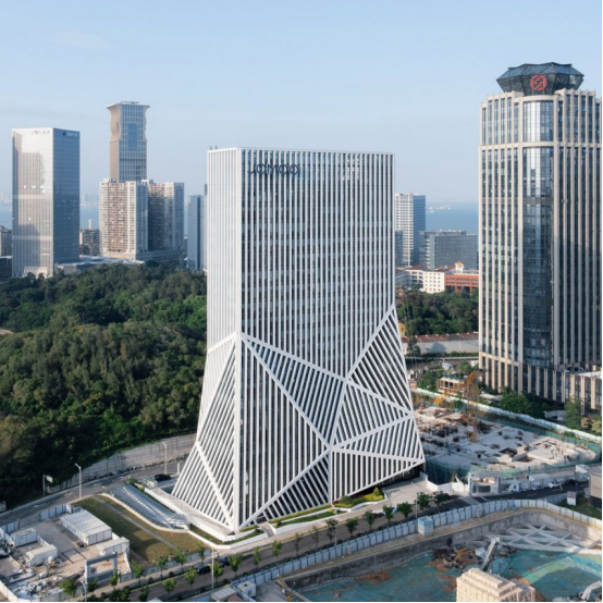 设计灵感来源于福建省多石的山地地形,OMA通过将裙楼部分向上拉伸,在塔楼底部形成了一个山形基座,并在立面上形成一系列角度。