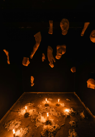 "我最喜欢思考的概念是尘世与宇宙世界的关系——我喜欢创作那些既充当灵性媒介,又反映我们今日所处黑暗世界的形态,"艺术家 Dima Srouji 说。"我发现蜡尤其体现了这种二元性,它是热的、动态的,闻起来像教堂的气味,能照亮黑暗,同时它本身也是潜在破坏的工具。" Srouji 的这幅作品名为《幻影祭品》。