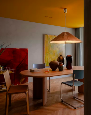 Studio Prineas 设计的这套悉尼公寓采用了黄色、橙色和红色的阴郁色调。餐厅区配备了澳大利亚设计品牌Jardan的August餐桌、Cassina的Cab餐椅和蓝色Thonet Gmbh S 43餐椅。黄色和红色的艺术品来自Gemma Smith 2023年的《多元》系列。
