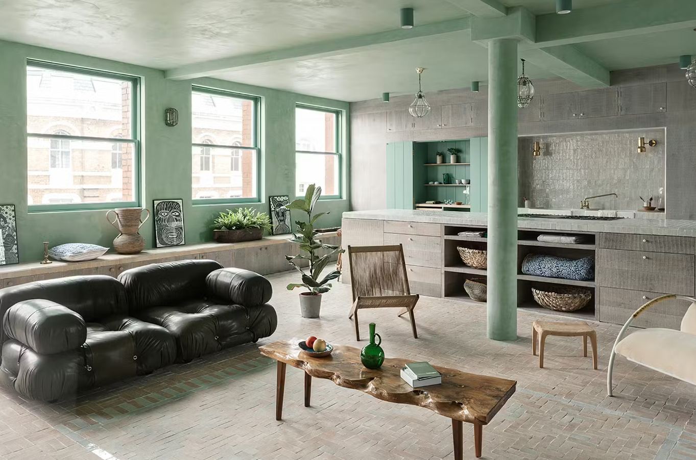 一张由Mario Bellini为B&B Italia设计的复古橄榄绿皮革Camaleonda沙发,奠定了这套位于伦敦肖尔迪奇高街前鞋厂的居住/工作公寓的基调。这款模块化沙发采用创新的电缆、挂钩和圆环系统,可以根据需要重新配置。